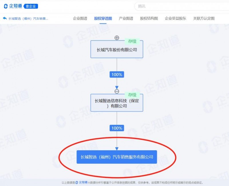 股權(quán)穿透圖顯示:該公司由長城智選信息科技(保定)有限公司全資持股,后者為長城汽車全資子公司。
